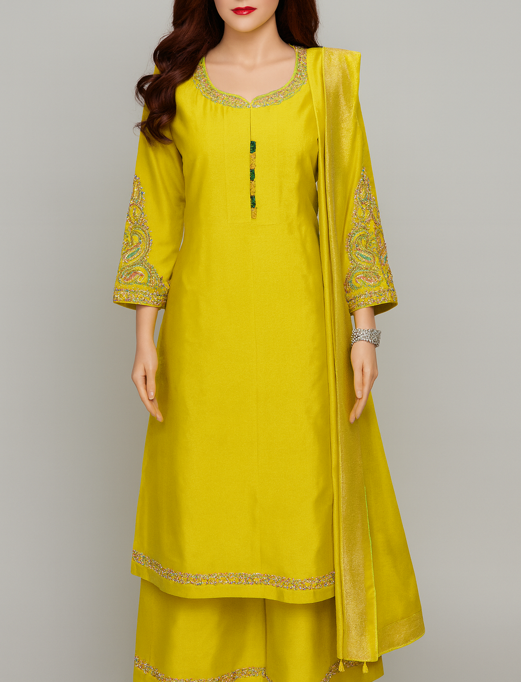 Be the first to review “Pure Roman silk centre cut suit with palazzo pants and banarasi dupatta”