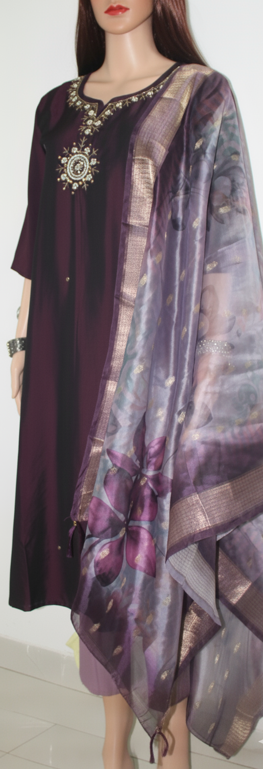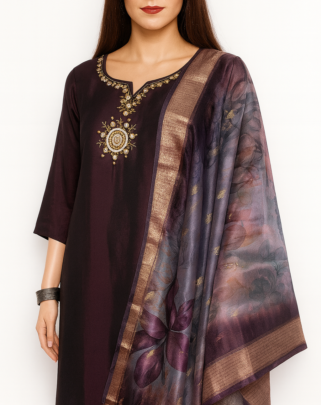 Be the first to review “Roman silk v neck handwork and digital dupatta with straight pants”